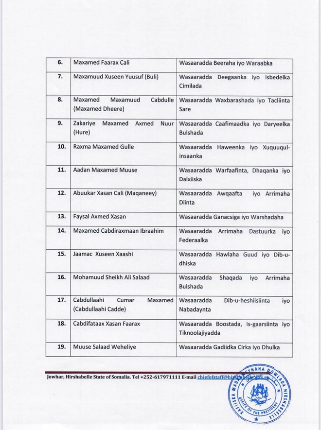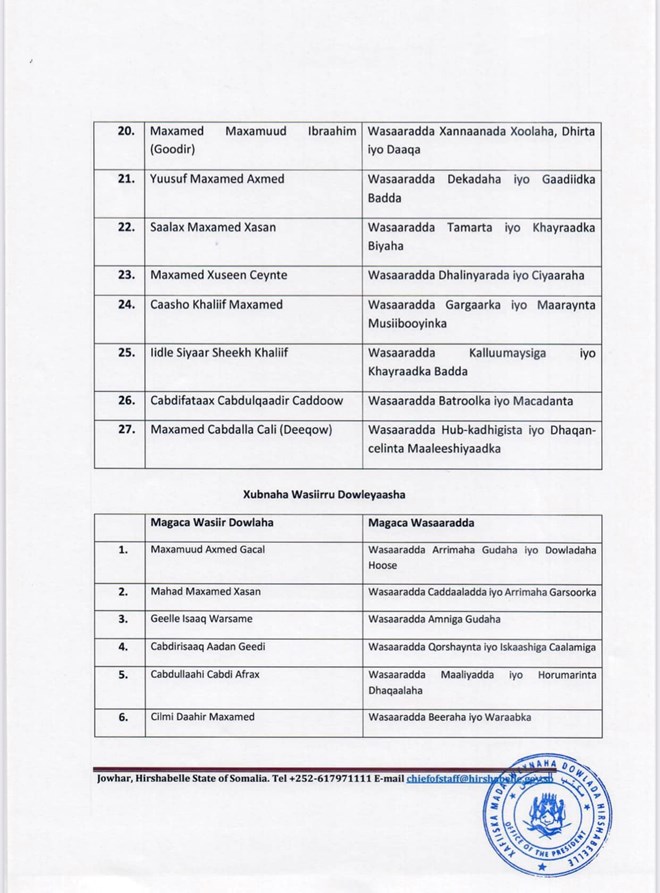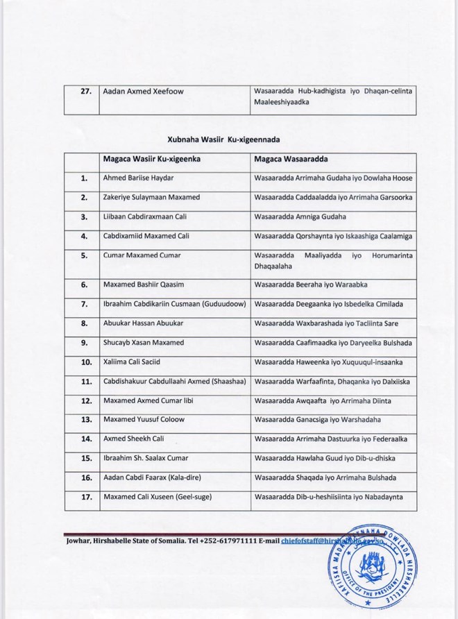 Madaxweynaha Hirshabeelle oo magacaabay Golaha Wasiirrada oo 81 xubnood ka kooban