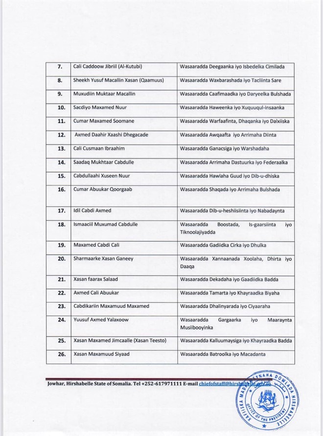 newsinsideGolaha wasiirrada ee u caawa magacaabay ayaa ka kooban 81 xubnood oo isugu jira 27 Wasiir, 27 Wasiir Kuxigeen iyo 27 Wasiiru Dowle.