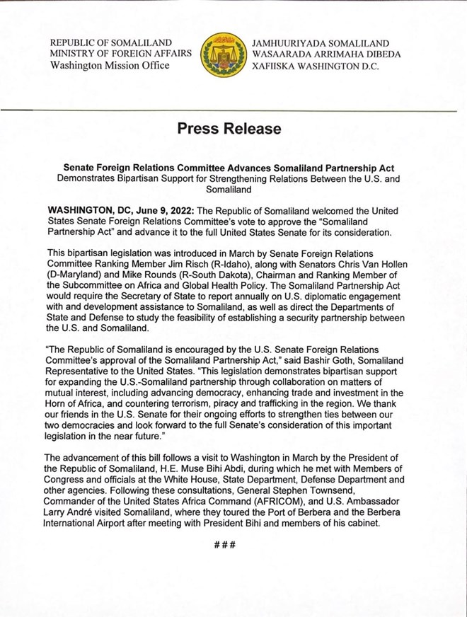 Jimco, Juun, 10, 2022 (HOL) - Xukuumada Somaliland, ayaa soo dhawaysay "Xeerka wada shaqaynta Somaliland iyo Maraykanka" oo shalay Guddida Arrimaha Dibbada ee Kongaraska Maraykanku ansixiyeen isla markaana u gudbiyeen golaha koongaraska.