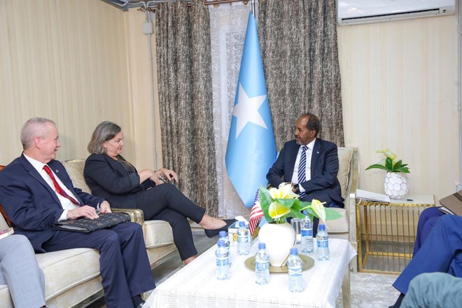 Isniin, Juun, 13, 2022 (HOL) - Madaxweynaha Soomaaliya Xasan Sheekh Maxamuud ayaa kulan la qaatay wafdi ay hoggaamineyso ku-xigeenka Arrimaha Siyaasadda ee Xoghayaha Arrimaha Dibedda Maraykanka Victoria Nuland oo uu weheliyo Danjiraha Maraykanka ee Soomaaliya Larry André.