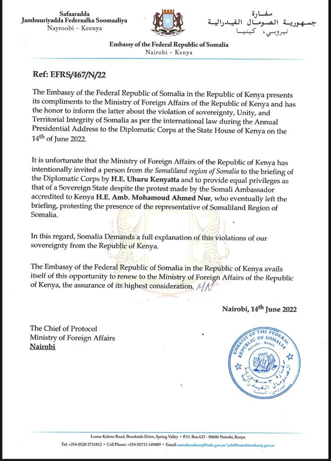 Talaado, Juun, 14, 2022 (HOL) - Safaaradda Soomaaliya ee Kenya ayaa ku eedeysay wasaaradda arrimaha dibadda Kenya inay ku xadgudubtay midnimada iyo madax bannaanida soohdimeed ee qaranimada Soomaaliya.