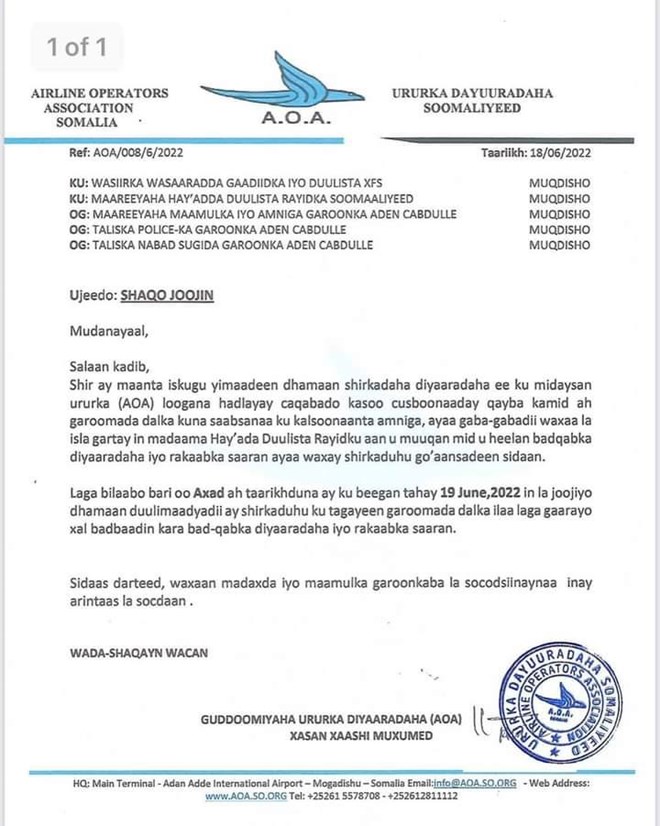newsinsideWarsaxafadeedka kasoo baxay kulanka madaxda Ururka diyaaradaha ee AOA ayaa lagu shaaciyay in laga bilaabo maalinta berito ah ay joojinayaan dhamaan duulimaadyadii diyaaradaha gobolada dalka, inta laga xalinaayo caqabadaha ay ka cabanayaan ee la xariira dhanka amniga.