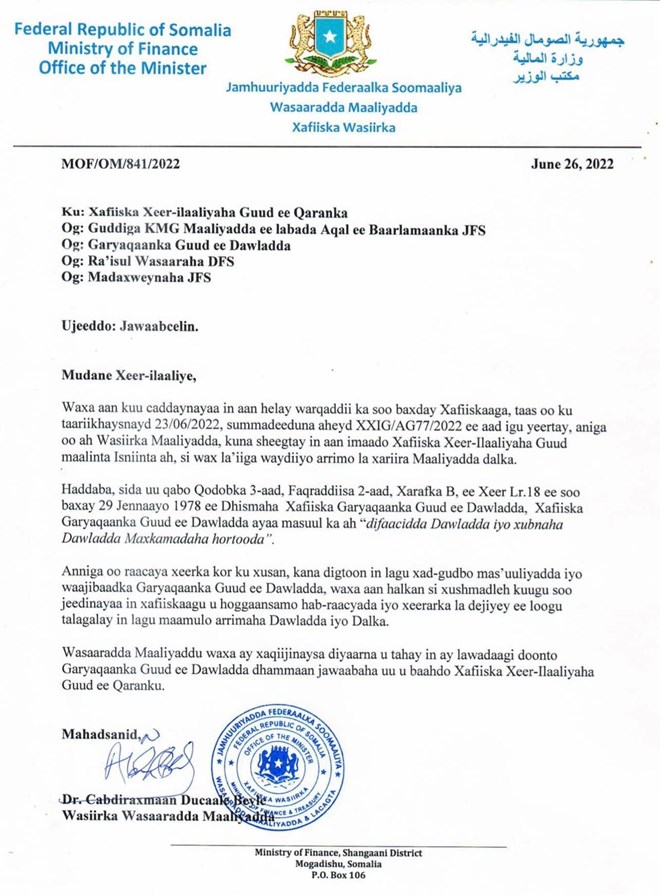 Axad, Juun, 26, 2022 (HOL) - Wasiirka maaliyadda Soomaaliya, Cabdiraxmaan Ducaale Bayle, ayaa sheegay inuu diyaar u yahay inuu iska difaaco su’aalo la xiriira arrimaha maaliyadda oo uga yimid xafiiska xeer ilaalinta.