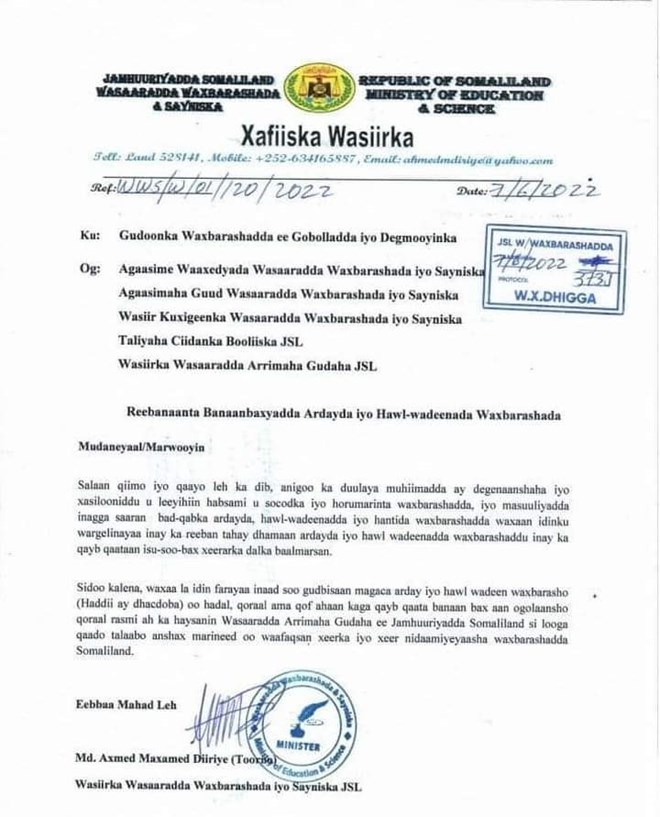 Talaado, Juun, 7, 2022 (HOL) - Wasaarada Waxbarashada Somaliland, ayaa ardayda iyo howlwadeenada waxbarashada uga digtay in ay ka qaybgalaan mudaharaadyada laga yaabo in axsaabta mucaaradku sameeyaan.