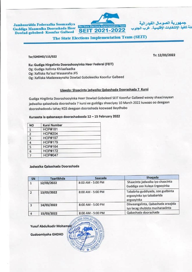 Sabti, Maarso, 12, 2022 (HOL) - Guddiga doorashooyinka maamulka Koonfur Galbeed Soomaaliya ayaa soo saaray jadwalka qabashada doorashada 7 kursi oo ahaa kuraasta ugu dambeysa ee deegaan doorashadoodu tahay magaalada Baydhabo iyo guud ahaan Koonfur Galbeed.