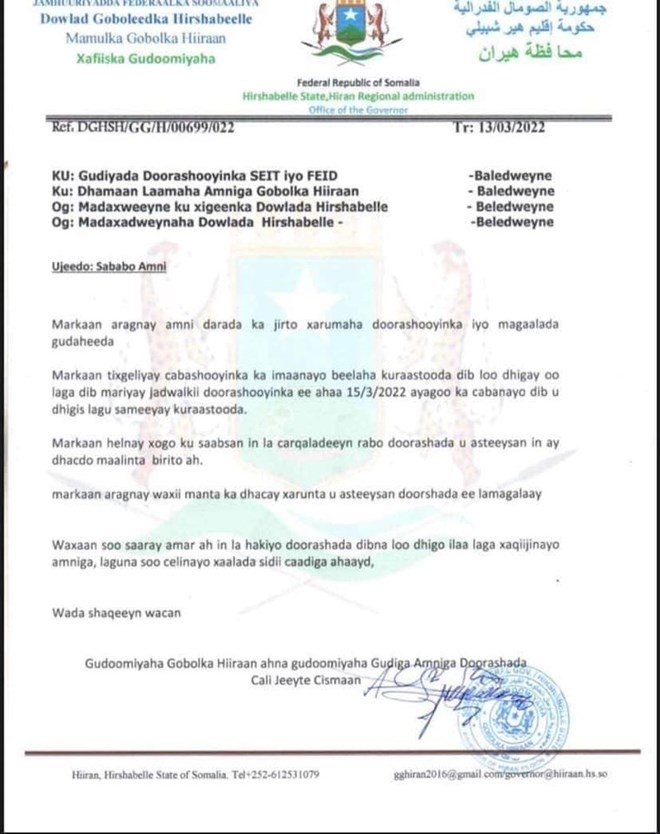Axad, Maarso, 13, 2022 (HOL) - Gudoomiyaha gobolka Hiiraan Cali Jeyte Cismaan ayaa war qoraal ah oo uu soo saaray ku sheegay inuu hakiyey doorashada kuraasta harsan ee taala magaalada Beledweyne sababo uu ku sheegay inay la xiriiraan amni iyo isqabqbasi ka dhexjira beelaha uu ka dhaxeeyo kuraasta aan wali doorashadooda la qabanin.