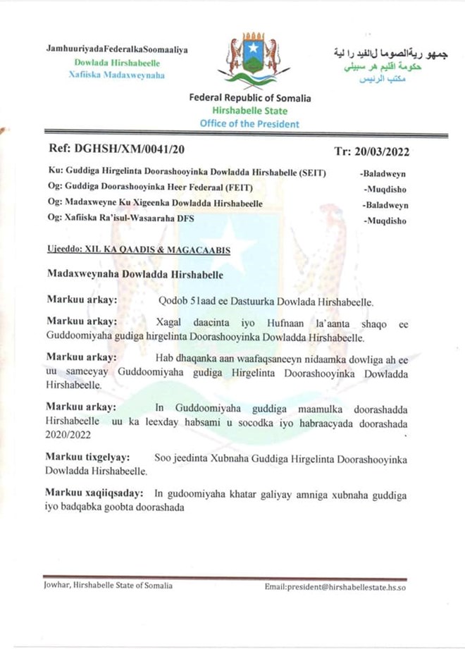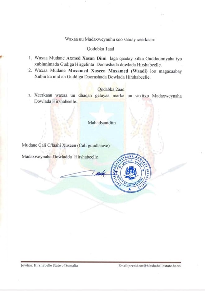 Hoos ka akhriso wareegtada xilka looga qaaday guddoomiyahii guddiga doorashada Hirshabeelle:-