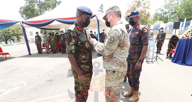 newsinsideAgaasimaha Hawlgalka ee AFRICOM Sarreeye Gaas Gregory Anderson ayaa abaal-marinno guddoonsiiyey Kornayl Daniel Rotich, Major Martin Muthaura iyo Corporal Peter Shikuri, iyagoo ku mutaystay jawaab-celintii degdegga ahayd ee ay ka bixiyeen ka-hortagga weerarkii Camp Simba ee Manda.