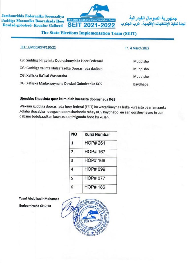 Jimco, Maarso, 4, 2022 (HOL) - Guddiga doorashada maamulka Koonfur Galbeed Soomaaliya ayaa soo saaray lix kursi oo ka mid ah kuraasta deegaan doorashadooda tahay magaalada Baydhabo ee xarunta gobolka Baay.