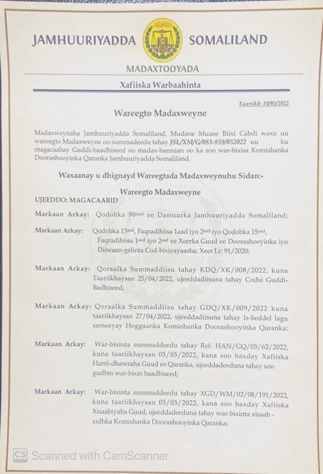 Talaado, May, 10, 2022 (HOL) - Madaxweynaha Somaliland Muuse Biixi Cabdi, ayaa magacaabay guddi 5 qof ka kooban, oo baadhis ku samayn doonta khilaafka maamul ee ka dhexeeya Guddida Doorashooyinka Somaliland.