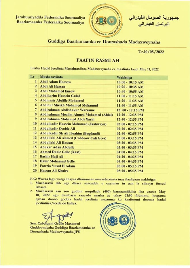 Guddiga doorashada madaxweynaha ayaa sidoo kale shaaciyay magacyada 20 Musharax ee maalinta berito ah khudbadahooda ka horjeedin doona labada Gole ee Baarlamaanka Fedaraalka Soomaaliya, waxaana Musharax walba loo qorsheeyay inuu khudbadiisa kusoo koobo mudo 15- daqiiqo ah.