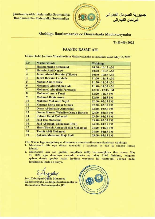 Talaado, May, 10, 2022 (HOL) - Guddiga doorashada madaxweynaha Soomaaliya ayaa Galabta soo gabagabeeyay diiwaan galinta Musharaxiinta madaxweynaha 10-aad ee Jamhuuriyadda Fedaraalka Soomaaliya oo socotay sadaxdii maalmood ee lasoo dhaafay.