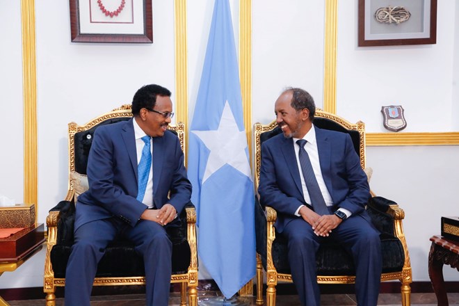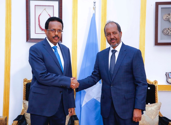 Talaado, May, 17, 2022 (HOL) - Madaxweynaha cusub ee Soomaaliya Xasan Sheekh Maxamuud ayaa kulan la qaatay Madaxweynaha xafiiska baneynaya Maxamed Cabdillahi Farmaajo. Waxaana la sheegay inay ka wada hadleen xil wareejinta xafiiska Madaxweynaha