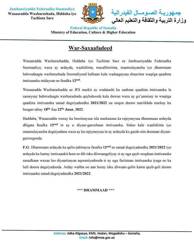 Sabti, May, 21, 2022 (HOL) - Wasaaradda Waxbarashadda Xukuumadda Fedaraalka Soomaaliya ayaa goordhaw shaacisay waqtiga rasmiga ah ee la qaadayo Imtixaanka shahaadiga fasalka 12-aad ee sanad Dugsiyeedka 2021-2022.