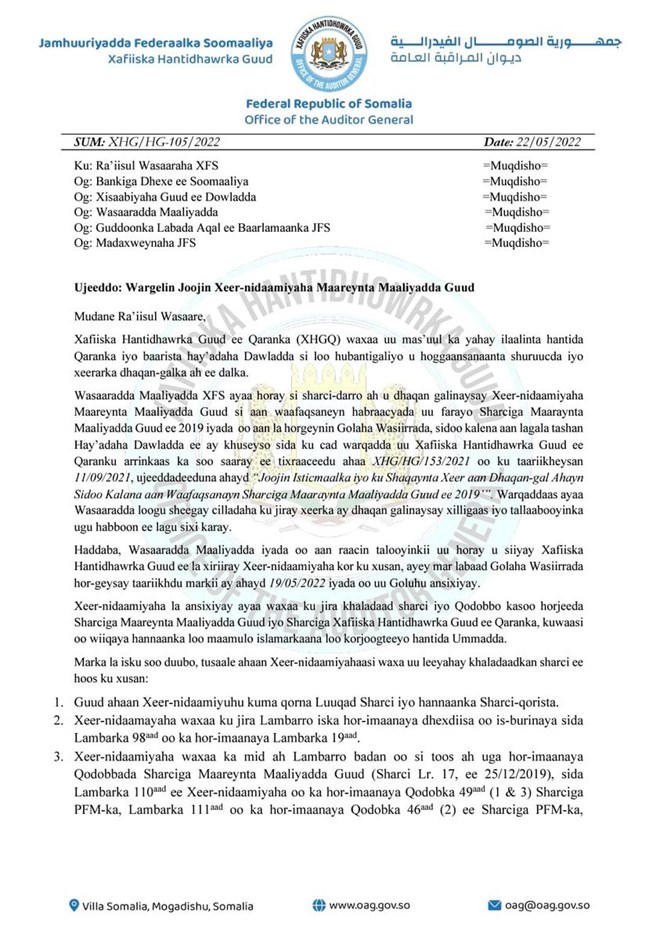 newsinsideWar qoraal ah oo uu soo saaray Hantidhawraha Qaaranka Maxamed Maxamuud Cali ayaa Raysal Wasaare Rooble lagu wargeliyay joojinta Xeer-nidaamiyaha sharciga maareynta Maaliyadda oo ay Golaha Wasiirradu ansixiyeen Khamiistii lasoo dhaafay.