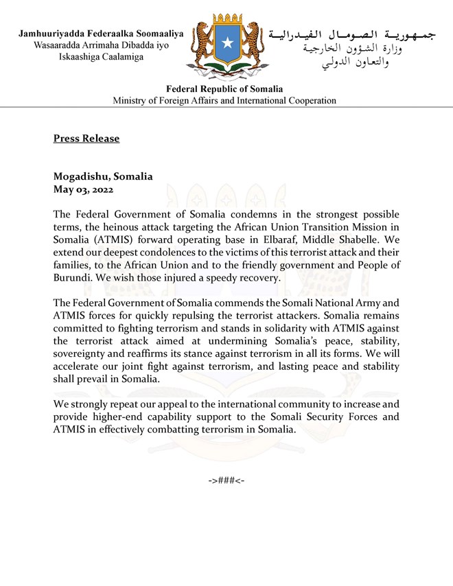 Arbaco, May, 4, 2022 (HOL) - Dowladda Soomaaliya ayaa war saxafadeed ay soo saartay waxay ku cambaareysay weerarkii Al-shabaab ay Shalay ku qaadeen Sadhiga ciidamada Burundi ay ku leeyihiin deegaanka Ceelbaraf ee gobolka Sh/dhexe, kaasoo geystay khasaare badan oo isugu jira dhimasho iyo dhaawac soo gaaray askar ka tirsan ciidanka Burundi.