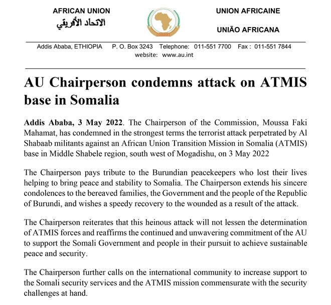 Dhanka kale guddoomiyaha Midowga Afrika ayaa dhankiisa war uu soo saaray waxa uu ku cambaareeyay weerarkii Al-shabaab ku qaadeen Saldhiga ciidanka Burundi ee deegaanka Ceelbaraf oo ka mid ah deegaanada hoostaga degmada Mahadaay ee gobolka Sh/dhexe.