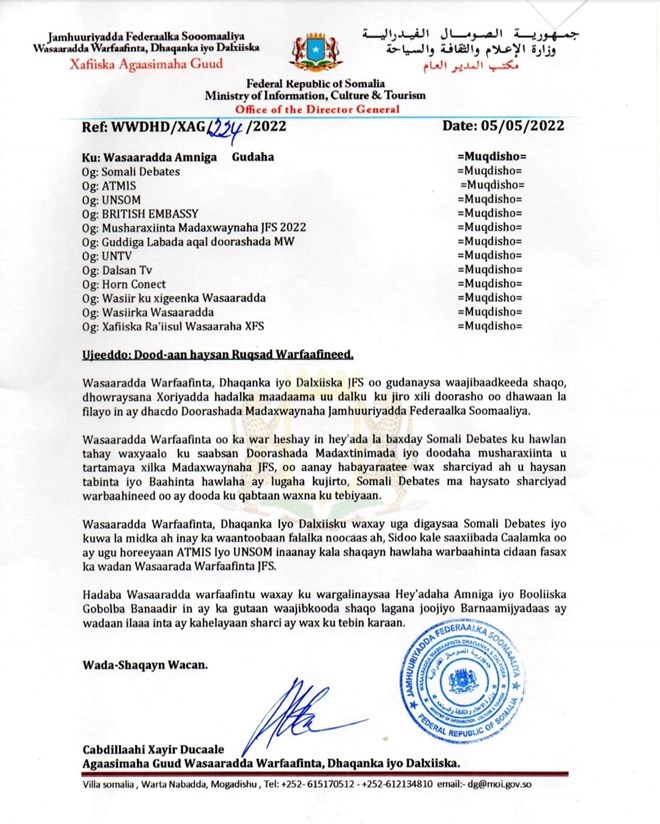 Khamiis, May, 5, 2022 (HOL) - Wasaaradda warfaafinta ayaa joojisay dood warbaahineed oo urur lagu magaacabo Somali debates uu u qaban lahaa musharraxiinta u taagan xilka madaxweynaha dowladda federalka Soomaaliya.