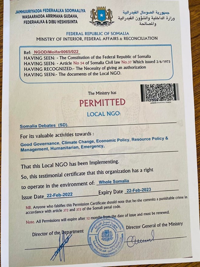 Somali Debates ayaa soo bandhigtay warqadda loogu oggolaaday inay dalka ka howlgalaan, taasoo ku taariikhaysan febraayo 2022, kuna eg febraayo 2023.