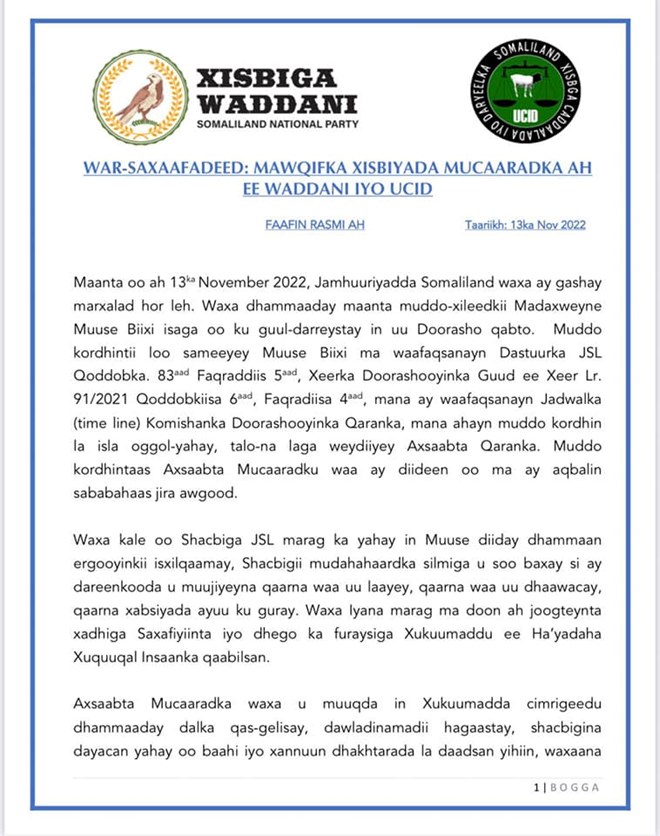 Axad, November, 13, 2022 (HOL) - Mucaaradka Somaliland ayaa ku dhawaaqay in ay gabi ahaanba kalsoonidii iyo aqoonsigii kala noqdeen madaxweynaha Somaliland Muuse Biixi Cabdi.