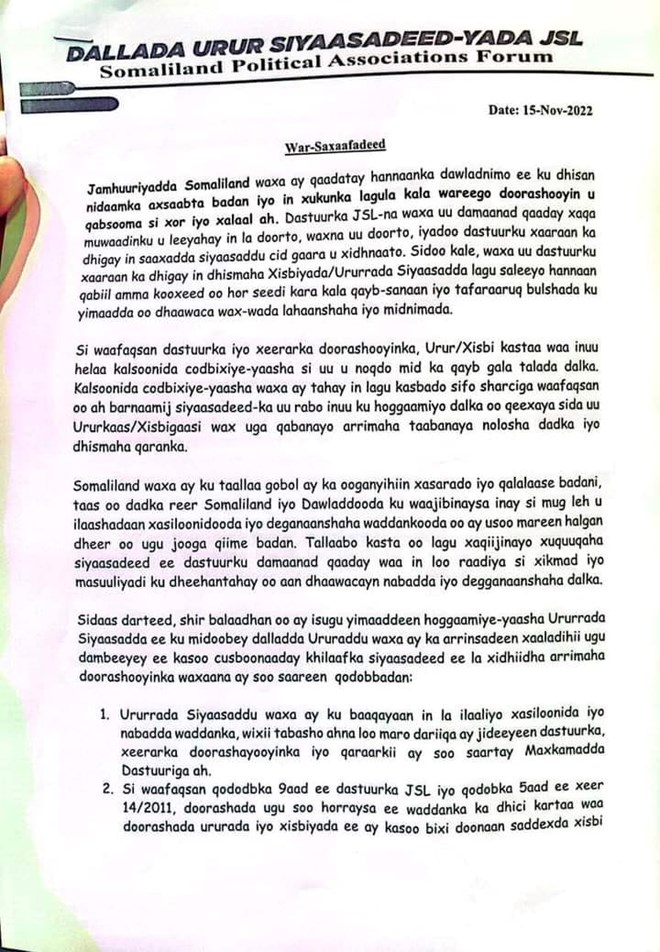 Talaado, November, 15, 2022 (HOL) - Ururada cusub ee siyaasada Somaliland, ayaa ku dhawaaqay qodobo ay kamid tahay in anay aqbalayn, wada-hadalo kasta oo dhexmara madaxweynaha iyo mucaaradka oo anay qayb ka ahyn.