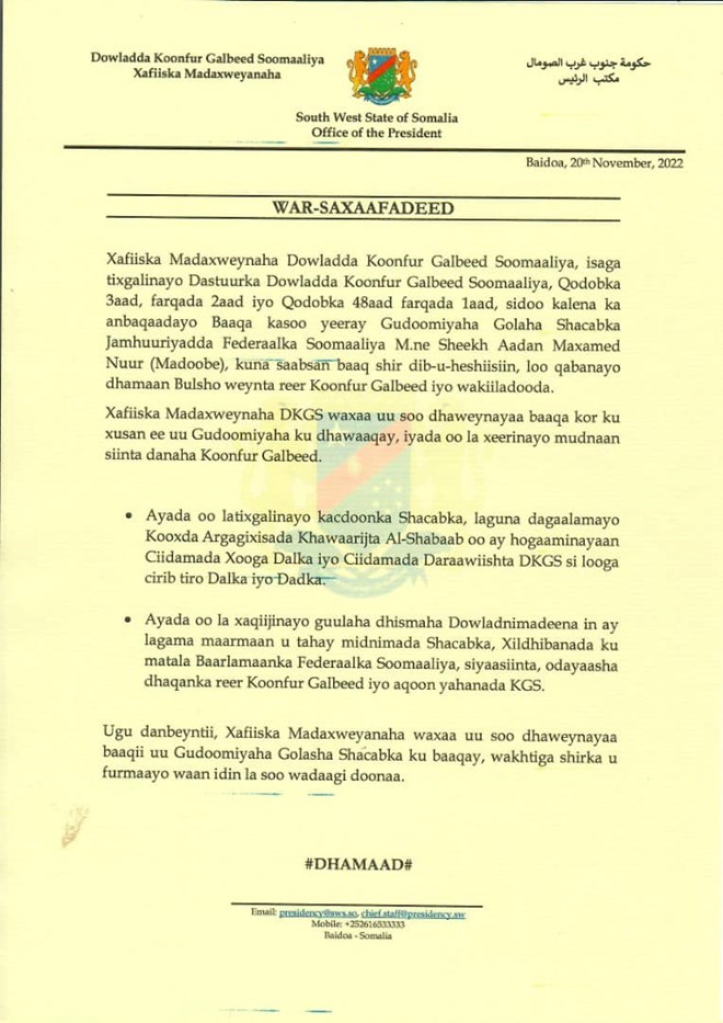newsinsideWar-saxaafadeed kasoo baxay madaxtooyada Koonfur Galbeed ayaa lagu sheegay, in madaxweynuhu isagoo tixgalinaya danaha Koonfur Galbeed uu aqbalay baaqa guddoomiyaha barlamaanka Soomaaliya.
