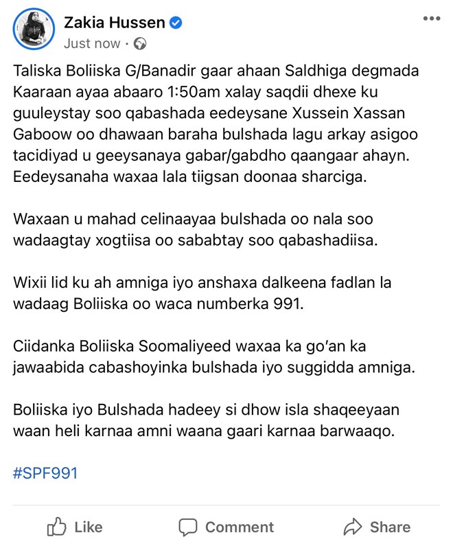 newsinsideTaliye ku xigeenka ciidanka Booliiska Soomaaliya, Gen Sakiye Xuseen oo qoraal ay soo dhigtay barteeda Twitter ayaa sheegtay in soo qabashada eedeysanaha ay gacan ka geysteen shacabka oo u soo gudbiyay xogta keentay in lasoo xiro.