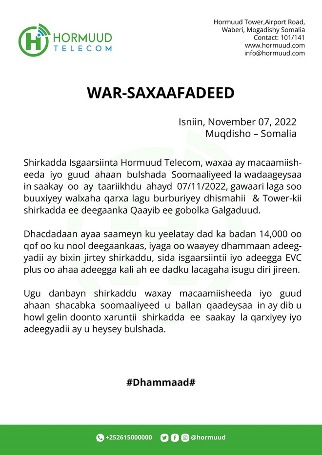 Talaado, November, 8, 2022 (HOL) - Shirkadda isgaarsiinta ee Hormuud Telecom ayaa sheegtay in mid ka mid ah xarumihii ay ku shaqeyn jirtay iyo taawar isgaarsiineed uu ku burburay Qarax ka dhacay deegaanka Qaayib oo ka tirsan maamulka Galmudug.