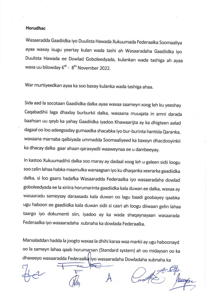 Talaado, November, 8, 2022 (HOL) - Shirkii heerka Wasiir ee Wasaaradaha Gaadiidka iyo Duulista Hawada heer Federaalka iyo Dawlad-gobolleedyada Dalka oo Muqdisho saddex maalin ka socday ayaa la soo gabagabeeyay , waxaa laga soo saaray warmurtiyeed.
