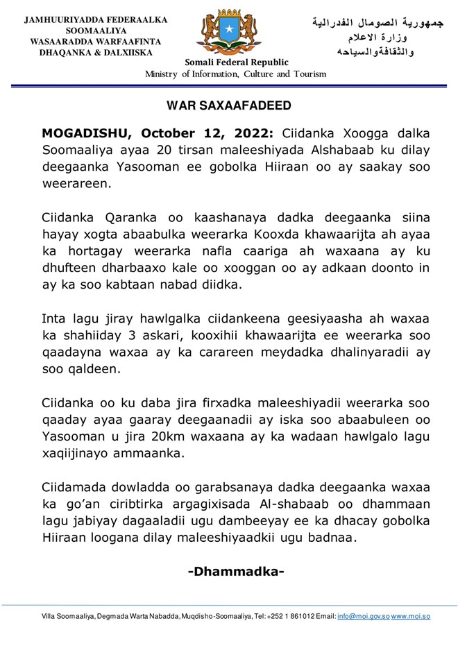 Arbaco, October, 12, 2022 (HOL) - Ciidanka militariga dowladda Soomaaliya iyo kuwa deegaanka ayaa 20 tirsan dagaalamaayaasha Alshabaab ku dilay deegaanka Yasooman ee gobolka Hiiraan oo ay saakay soo weerareen.