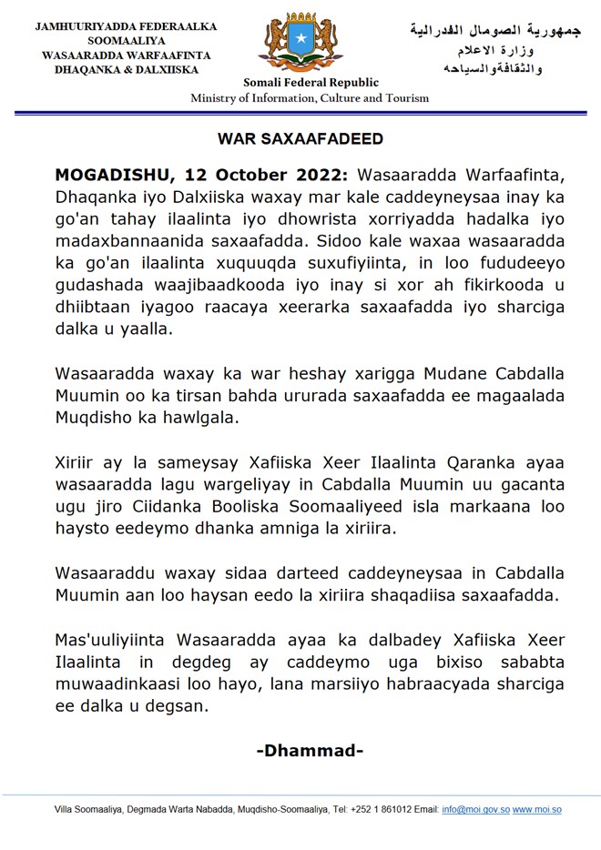Khamiis, October, 13, 2022 (HOL) - Wasaaradda warfaafinta Soomaaliya ayaa markii ugu horraysay warbixin kasoo saartay xarriga Cabdalle Axmed Muumin oo ah guddoomiyaha mid kamid ah ururada saxaafadda Soomaaliya.