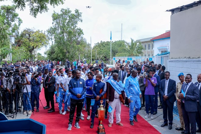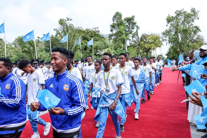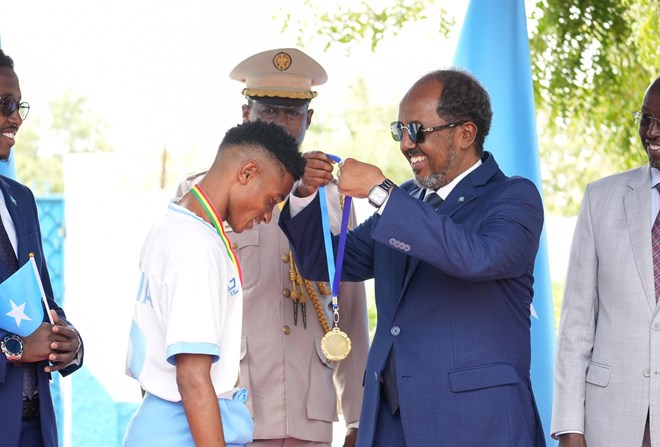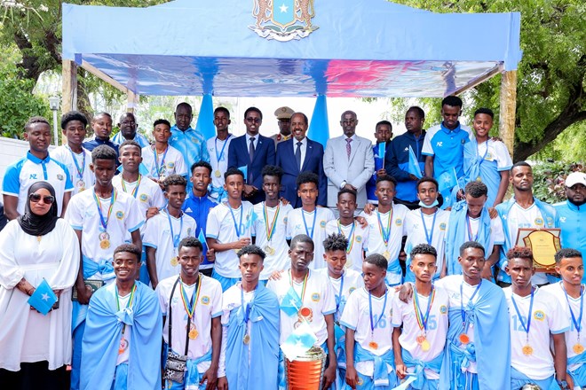 Isniin, October, 17, 2022 (HOL) - Iyadoo Maanta dalka ay dib ugu soo laabteen Xulka 17 jirada Qaranka Soomaaliya oo dhawaan kuso guuleystay koobka bariga iyo bartamaha Afrika ee CECAFA ayaa isla Maanta madaxweynaha dowladda Federaalka Soomaaliya Xasan Sheekh Maxamuud waxa uu munaasabad maamuus ah ugu sameeyey Madaxtooyada Qaranka, isagoona ku ammaanay Xulka 17 jirada inay kor u qaadeen magaca umadda Soomaaliyeed, dhalinyarada dalkana ay u fureen iridaha guusha.