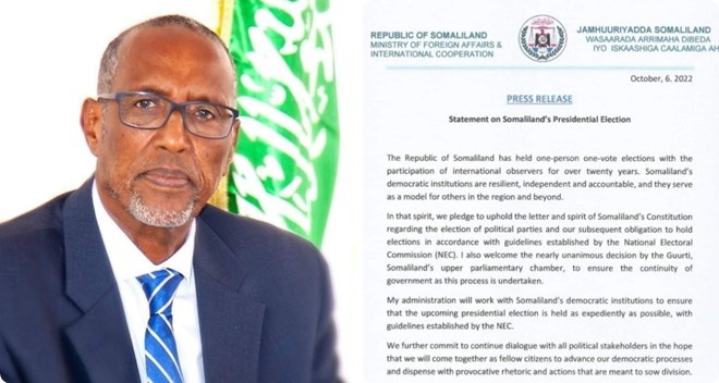 Khamiis, October, 6, 2022 (HOL) - Qoraal kasoo baxay Wasaarada Arrimaha Dibadda Somaliland, ayaa lagu sheegay in xukuumadu soo dhawaynayso muddo kordhinta iyo in doorashooyinka loo qaban doono sida ugu haboon ee ugu dhakhsaha badan.
