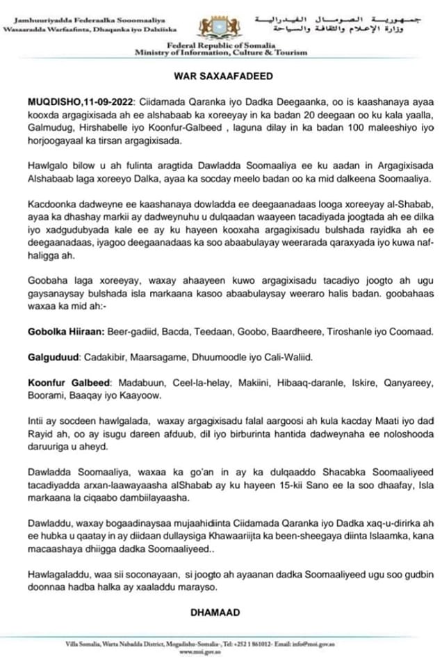 Isniin, September, 12, 2022 (HOL) - Dowladda Soomaaliya ayaa shaacisay in ciidamada qalabka sida iyo dadka deegaanka, oo is kaashanaya ay Alshabaab ka xoreeyeen in ka badan 20 deegaan oo kuyaalla, Galmudug, Hirshabelle iyo Koonfur-Galbeed.