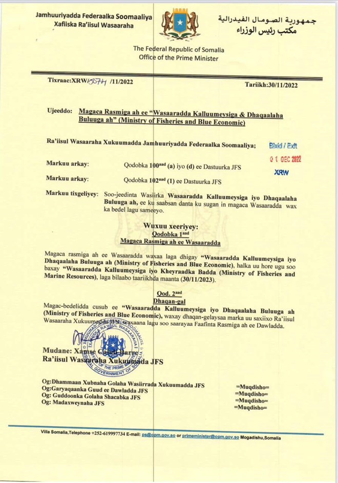 Axad, December, 4, 2022 (HOL) - Raysal wasaaraha Xukuumadda Fedaraalka Soomaaliya Xamse Cabdi Barre ayaa wareegto uu soo saaray waxa uu magaca kaga badalay Wasaaradda Kalluumeysiga iyo Kheyraadka Badda Soomaaliya.