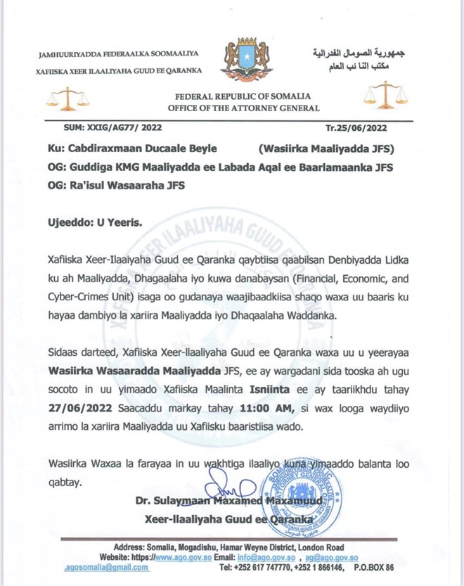 Sabti, Juun, 25, 2022 (HOL) - Wasiirka Maaliyadda Soomaaliya, Cabdiraxmaan Ducaale Bayle ayaa maanta looga yeeray xafiiska xeer ilaaliyaha guud ee qaranka, sida lagu sheegay qoraal rasmiya oo kasoo baxay xeer ilaaliyaha guud.
