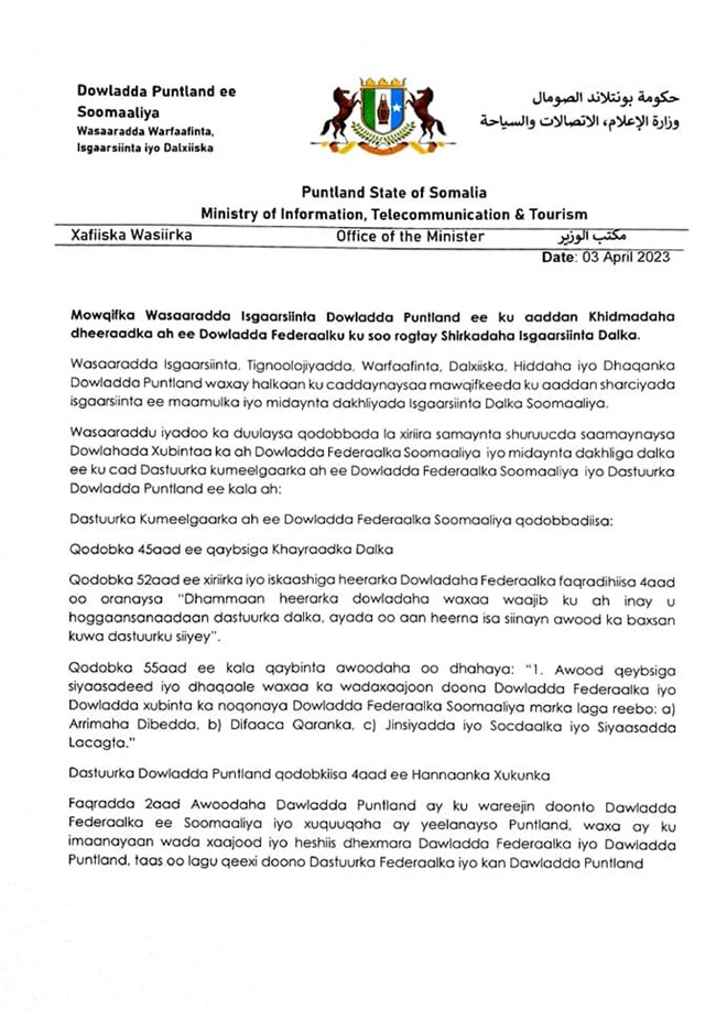 Wasaaraddu waxay fartay shirkadaha isgaarsiinta ee Puntland in aanay wax isbeddel ah ama saamayn ah ku yeelandoonin sharciyada kasoo baxay Dowladda federalka Soomaaliya.