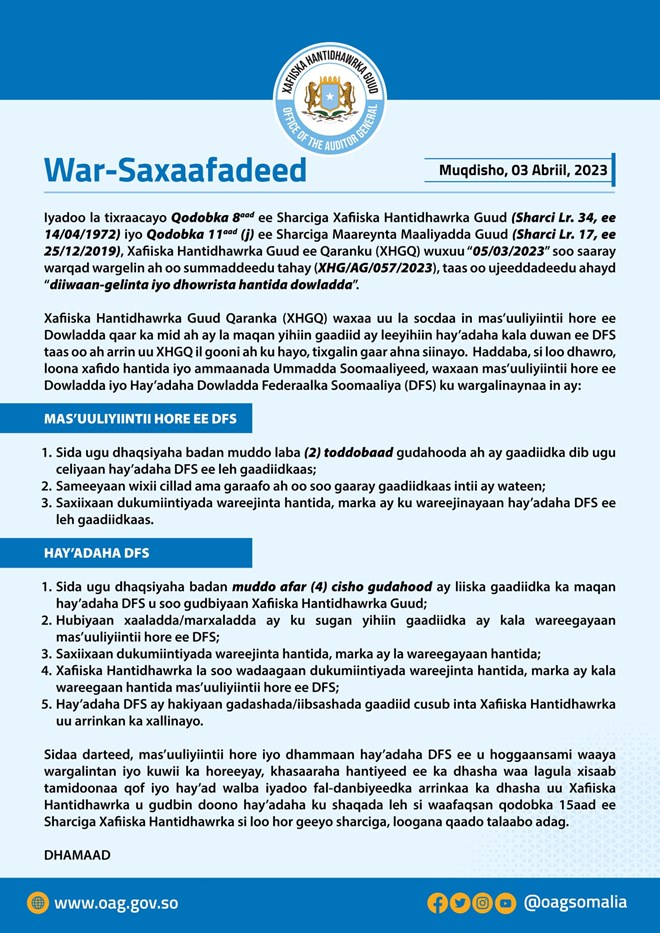 Hoos ka akhriso Qoraalka kasoo baxay Xafiiska Hantidhowrka guud ee Qaranka oo dhameystiran:-