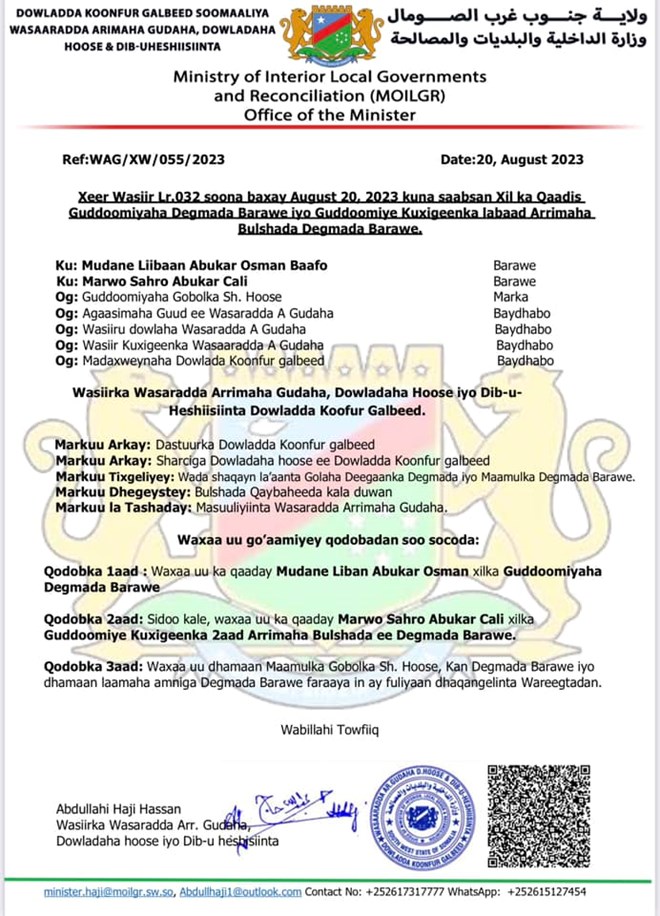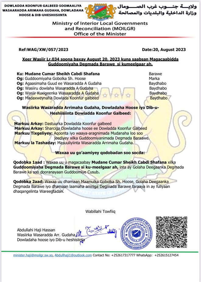newsinsideWar saxaafadeed kasoo baxay wasaaradda arrimaha gudaha, ayaa lagu sheegay, sababta xilka looga qaaday guddoomiyaha in ay tahay, wada shaqayn la’aanta golaha degaanka Baraawe iyo maamulka degmada Baraawe.