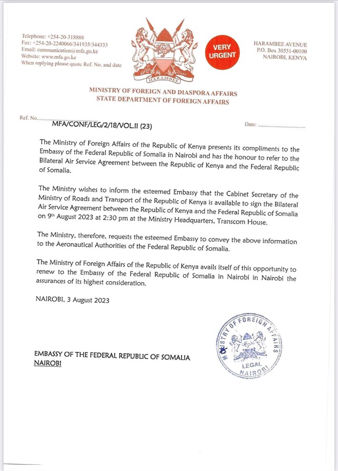 Arbaco, Agoosto, 9, 2023 (HOL) - Dowladaha Soomaaliya iyo Kenya ayaa lagu wadaa inay maanta magaalada Nayroobi ku kala saxiixdaan heshiis dhanka hawada ah.