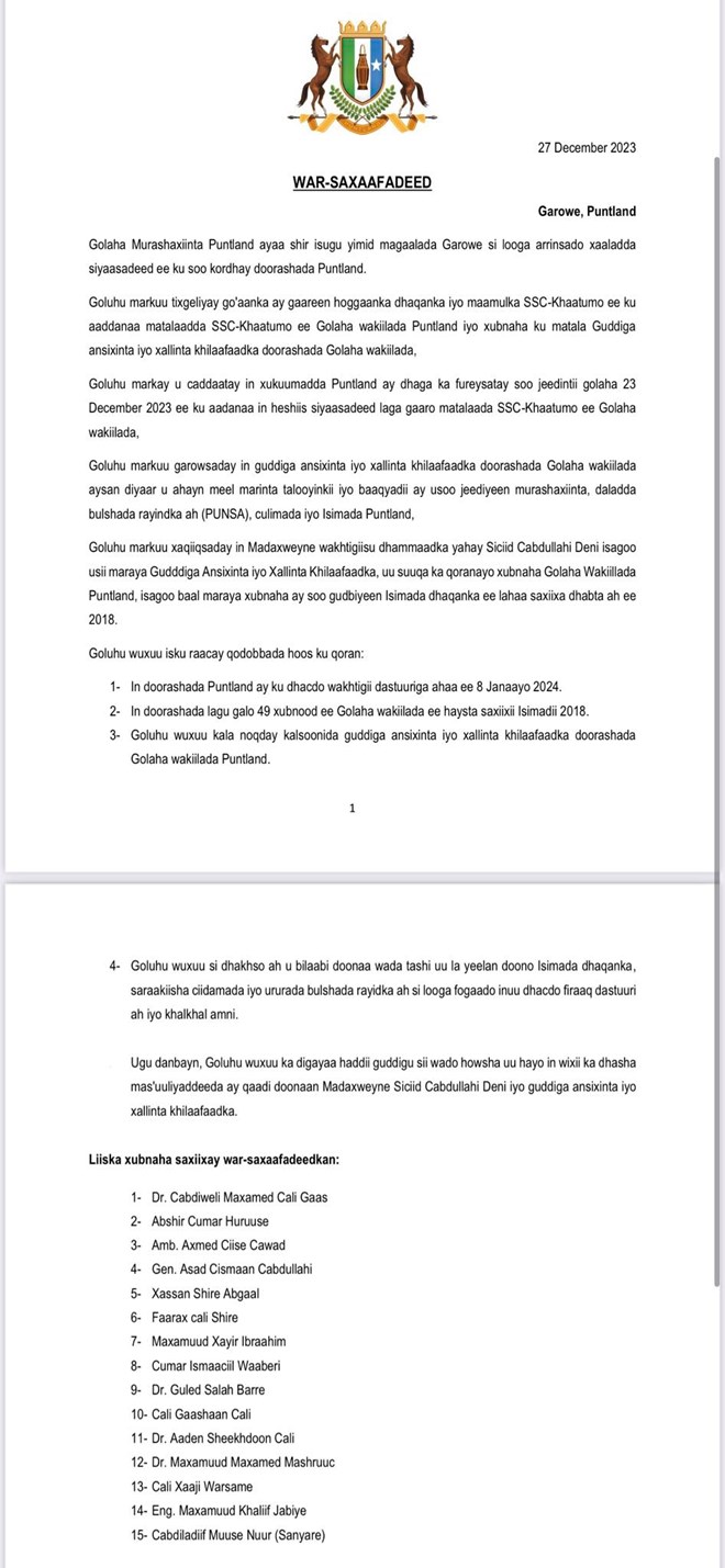 Si looga hortagga boobka kuraasta SSC, Waxay sheegeen in doorashada lagu galo 49 xildhibaan, maaddaama ay sheegeen in madaxweyne Deni uu diiday in heshiis siyaasadeed laga gaaro habka ay ku imaanayaan 17-ka xildhibaaan ee SSC- Khaatumo.