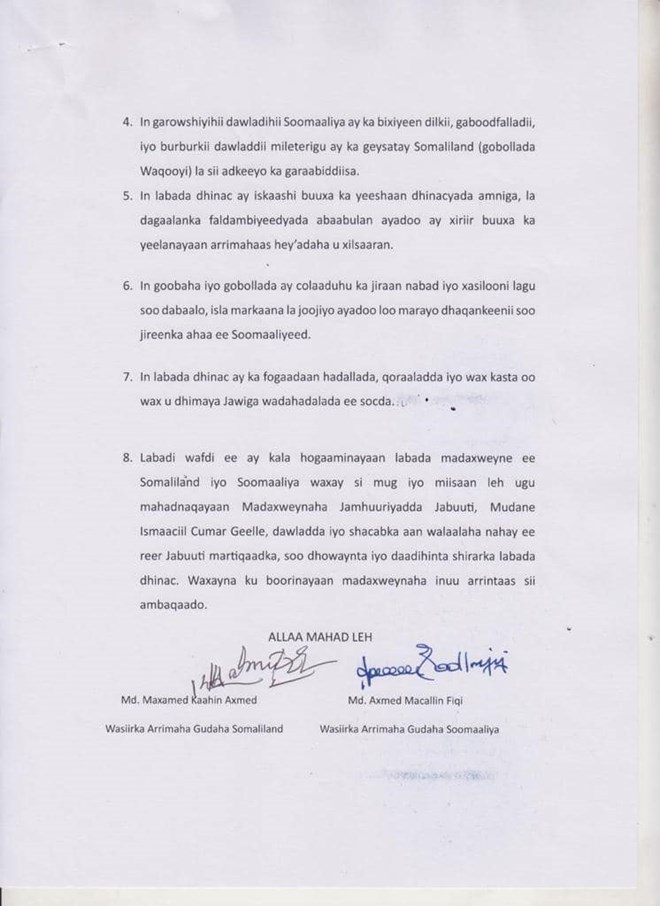 newsinsideWar murtiyeedka ayaa ka kooban sideed qodob, waxaana lagu sheegay in labada dhinac ay isla meel dhigeen in dib loo amba qaado geedi socodka wadahadaladii u dhaxeeyay Soomaaliya iyo Somaliland oo mudo badan hakad ku jiray.