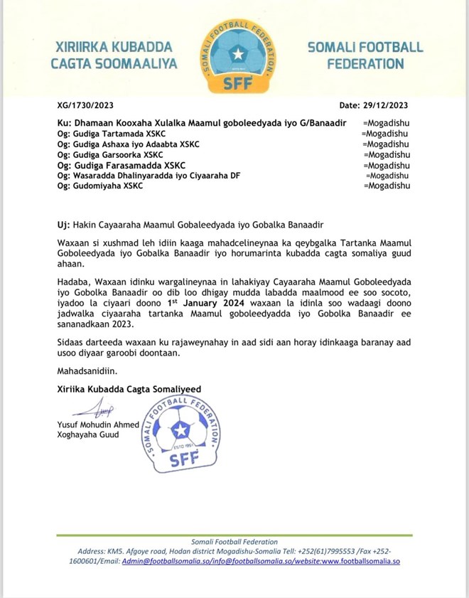 Sabti, December, 30, 2023 (HOL) - Xiriirka kubadda cagta Soomaaliyeed ayaa shaaciyay in dib loo dhigay muddo laba maalin ah tartanka Ciyaaraha kubada cagta dowlad goboleedyada dalka iyo gobolka Banaadir oo Shalay si rasmi ah uga furmay garoonka kubadda Cagta Stadium Muqdisho oo ay ku wada ciyaareen Galmudug iyo Hirshabeelle oo ku kala baxay barbar dhac.