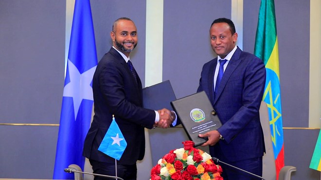 Jimco, December, 8, 2023 (HOL) - Wasiirrada Gaashaandhigga Soomaaliya iyo Itoobiya ayaa kala saxiixday heshiis cusub oo iskaashi oo dhanka difaaca ah iyo dadaallada wadajirka ah ee lagu horumarinayo nabadda iyo amniga Geeska Afrika.