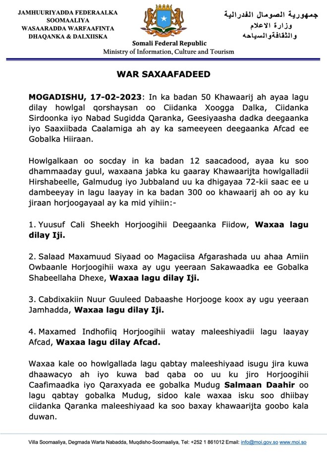Sabti, February, 18, 2023 (HOL) - Ciidamada Qalabka sida ee dowladda Soomaaliya iyo kuwa dib u xoraynta ayaa dilay in ka badan 50 ka tirsan Al-Shabaab oo ay ku jiraan 5 horjooge.