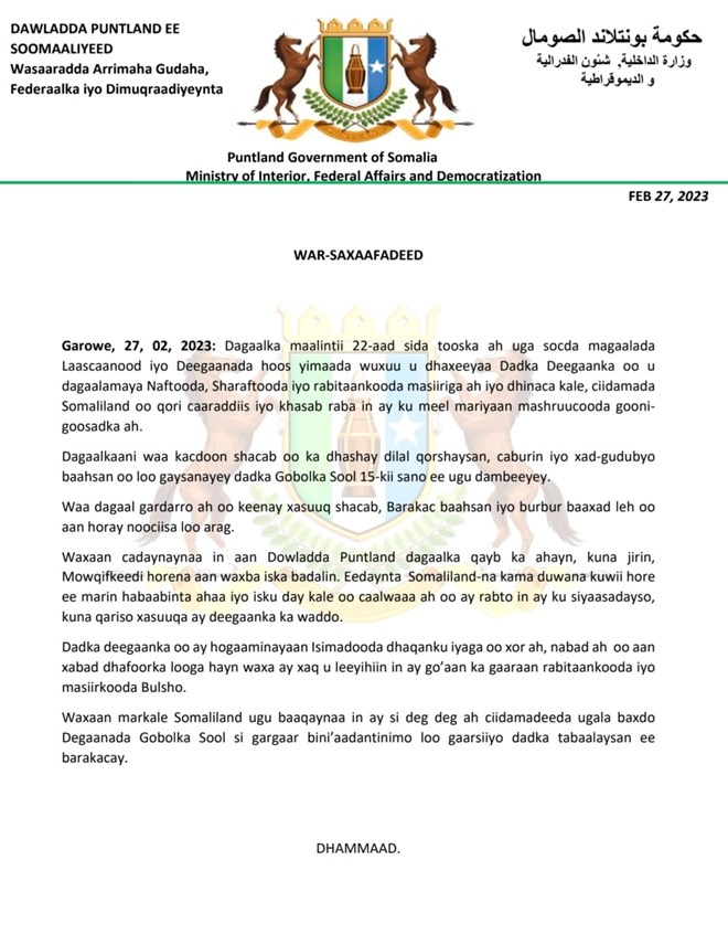 Isniin, February, 27, 2023 (HOL) - Maamulka Puntland ayaa mar kale iska fogeeyay inuu qayb ka yahay dagaalka maalintii 22-aad ka socda magaalada Laascaanood ee xarunta gobolka Sool.