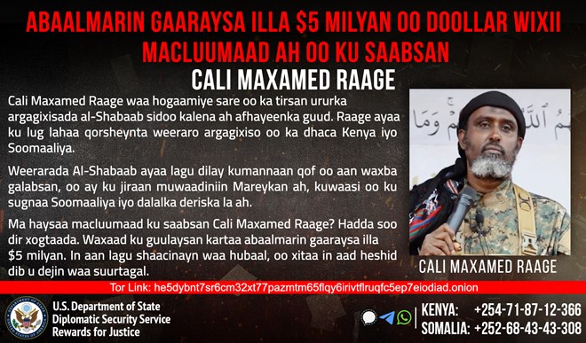 Talaado, February, 28, 2023 (HOL) - Mareykanka ayaa ku dhawaaqay abaal marin lacageed oo gaareysa 5 Milyan oo doolar oo ay duldhigtay Afhayeenka guud ee kooxda Al-shabaab Cali Maxamuud Raage Cali Dheere.