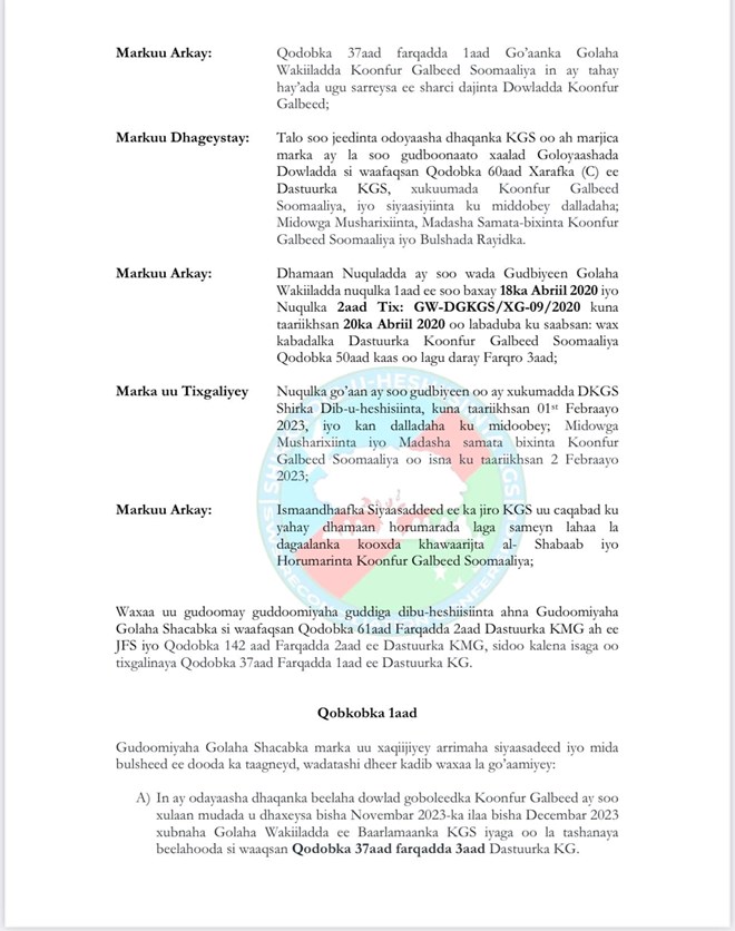 newsinsideWaxaa lagu heshiiyay in doorashada madaxweynaha Koonfur Galbeed la qabto bisha January ee sanadka 2024, waxaana sidaasi dhaqangal ku noqday halkii sano ee madaxweyne Lafta Gareen loogu kordhiyay.