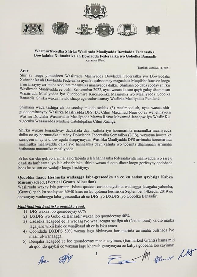 Gabagabadeydii shirkaan ayaa waxa laga soo saaray War murtiyeedka ay saxiixeen Wasiirrada Maaliyadda dowladda Fedaraalka, dowlad goboleedyada iyo Maamulka Gobolka Banaadir.