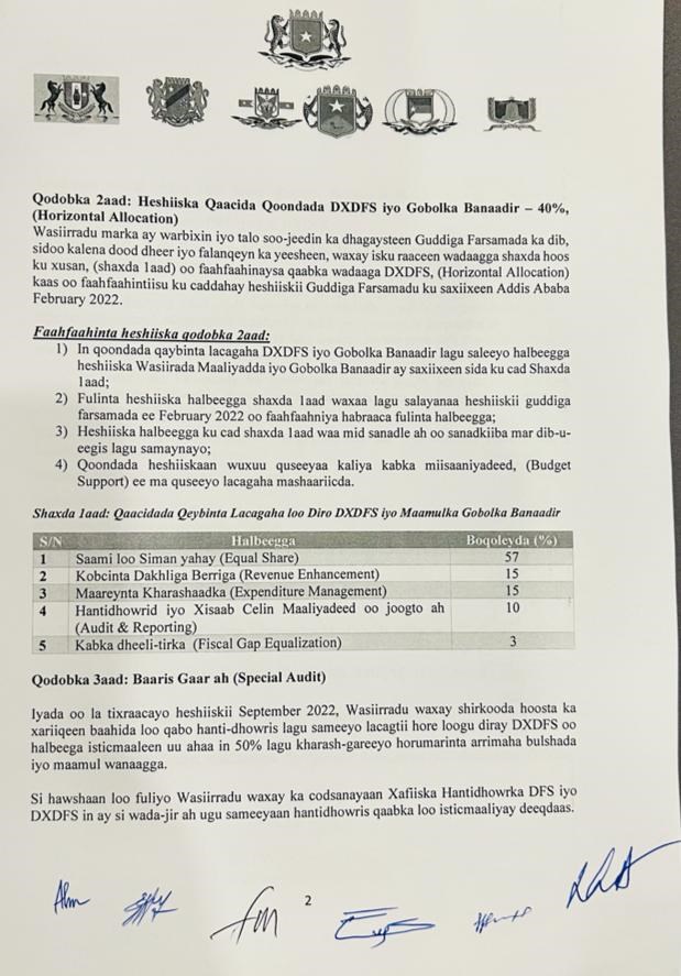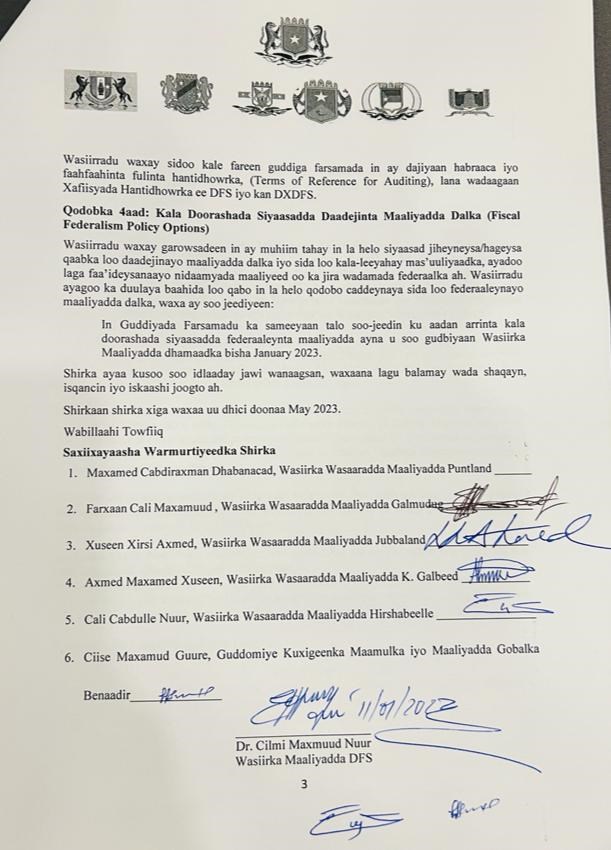 Arbaco, January, 11, 2023 (HOL) - Waxaa Maanta magaalada Muqdisho lagu soo gabagabeeyay shir sadaxdii maalmood ee lasoo dhaafay ay lahayeen Wasiirada Maaliyadda dowladda Fedaraalka Soomaaliya, dowlad goboleedyada dalka iyo Maamulka gobolka Banaadir.